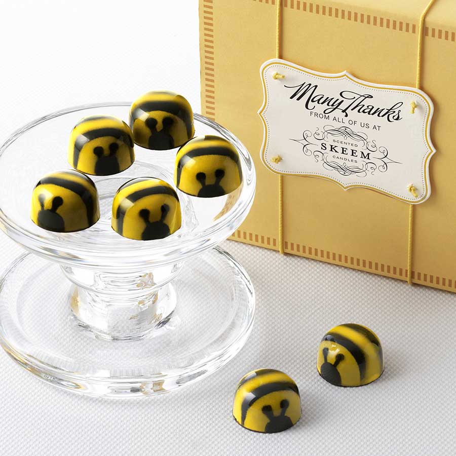 HONEY CARAMEL BEES INGREDIENTS — 62% Dark Chocolate (cocoa beans, sugar, cocoa butter, emulsifier: sunflower lecithin, natural vanilla extract), Sugar, Clover Honey, Heavy Cream, Butter, Colored Cocoa Butter (cocoa butter, one or more of the following FD&C lakes or dyes: Blue 1, Blue 2, Red 40, Yellow 5, Yellow 6, mica and/or titanium dioxide), Sea Salt.