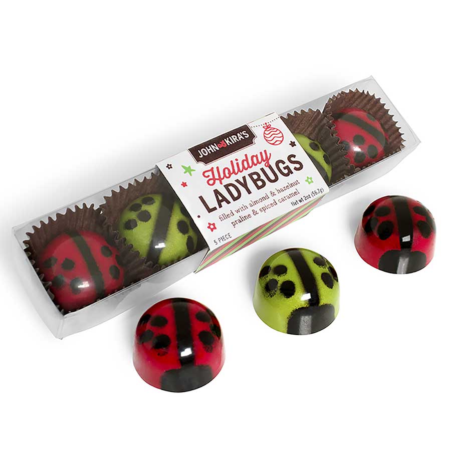 CARAMEL AND PRALINE HOLIDAY LADYBUGS INGREDIENTS — 62% Dark Chocolate (cocoa beans, sugar, cocoa butter, emulsifier: sunflower lecithin, natural vanilla extract), Almond & Hazelnut Praline (sugar, hazelnuts, almonds, emulsifier: sunflower lecithin, natural vanilla extract), Sugar, 40% Milk Chocolate (cocoa butter, whole milk powder, sugar, cocoa beans, brown sugar, natural vanilla extract, emulsifier: sunflower lecithin, barley malt extract), Clover Honey, Heavy Cream, Butter, Colored Cocoa Butter (cocoa butter, one or more of the following FD&C lakes or dyes: Blue 1, Blue 2, Red 40, Yellow 5, Yellow 6, mica and/or titanium dioxide), Sea Salt, Sunflower Lecithin, Cinnamon, Ginger, Nutmeg, Cloves.