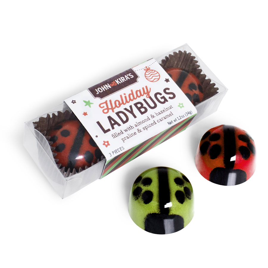 CARAMEL AND PRALINE HOLIDAY LADYBUGS INGREDIENTS — 62% Dark Chocolate (cocoa beans, sugar, cocoa butter, emulsifier: sunflower lecithin, natural vanilla extract), Almond & Hazelnut Praline (sugar, hazelnuts, almonds, emulsifier: sunflower lecithin, natural vanilla extract), Sugar, 40% Milk Chocolate (cocoa butter, whole milk powder, sugar, cocoa beans, brown sugar, natural vanilla extract, emulsifier: sunflower lecithin, barley malt extract), Clover Honey, Heavy Cream, Butter, Colored Cocoa Butter (cocoa butter, one or more of the following FD&C lakes or dyes: Blue 1, Blue 2, Red 40, Yellow 5, Yellow 6, mica and/or titanium dioxide), Sea Salt, Sunflower Lecithin, Cinnamon, Ginger, Nutmeg, Cloves.