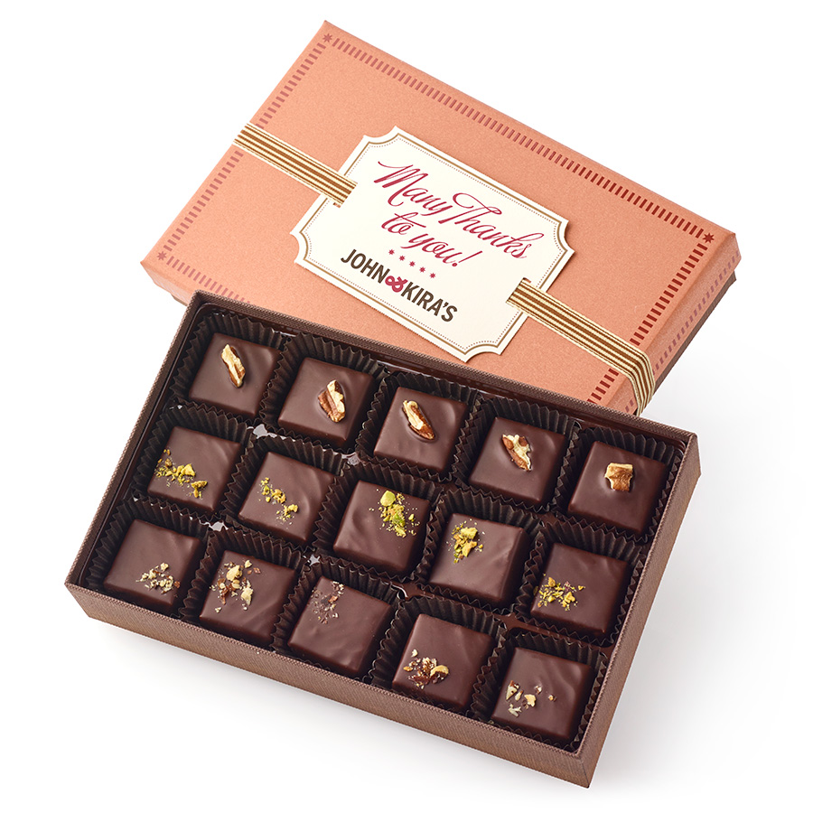 A delightfully nutty trio featuring squares of Pecan, Pistachio, and Crunchy Almond-Hazelnut Praline, each enrobed in a layer of 62% dark chocolate and topped with an assortment of chopped nuts. While our Praline Ladybugs, Snowflakes and other collections feature nuts blended with smooth milk chocolate, this collection features exclusively praline inside each piece with plenty of dark chocolate on top for a dense, richer, nuttier flavor profile.