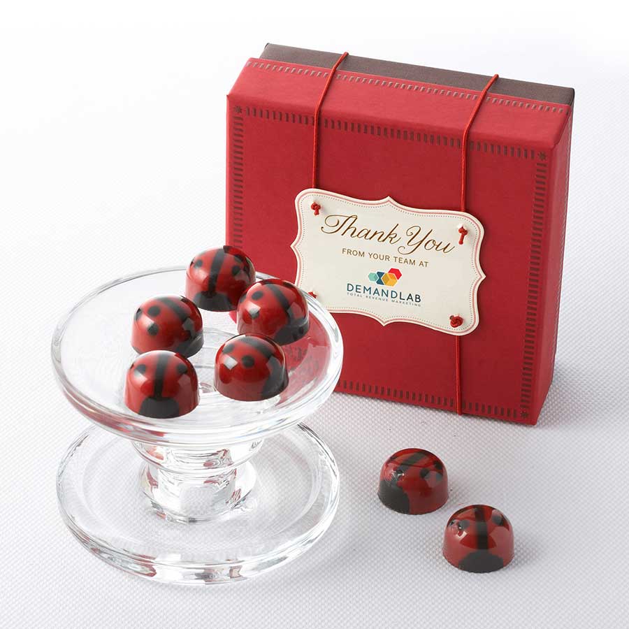 DARK CHOCOLATE LADYBUGS INGREDIENTS — 62% Dark Chocolate (cocoa beans, sugar, cocoa butter, emulsifier: sunflower lecithin, natural vanilla extract), 64% Dark Chocolate (cocoa beans, sugar, cocoa butter, emulsifier: sunflower lecithin, natural vanilla extract), Heavy Cream, Glucose, Colored Cocoa Butter (cocoa butter, one or more of the following FD&C lakes or dyes: Blue 1, Blue 2, Red 40, Yellow 5, Yellow 6, mica and/or titanium dioxide), Tahitian Vanilla Bean.