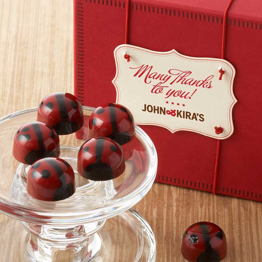 To make them, we hand-paint 62% Dark chocolate shells filled with colored cocoa butter, each one unique, and fill them with a delectable dark Valrhona 64% chocolate ganache and a hint of vanilla. Also called Lovebugs, these adorable critters are considered lucky and are said to bring good fortune!