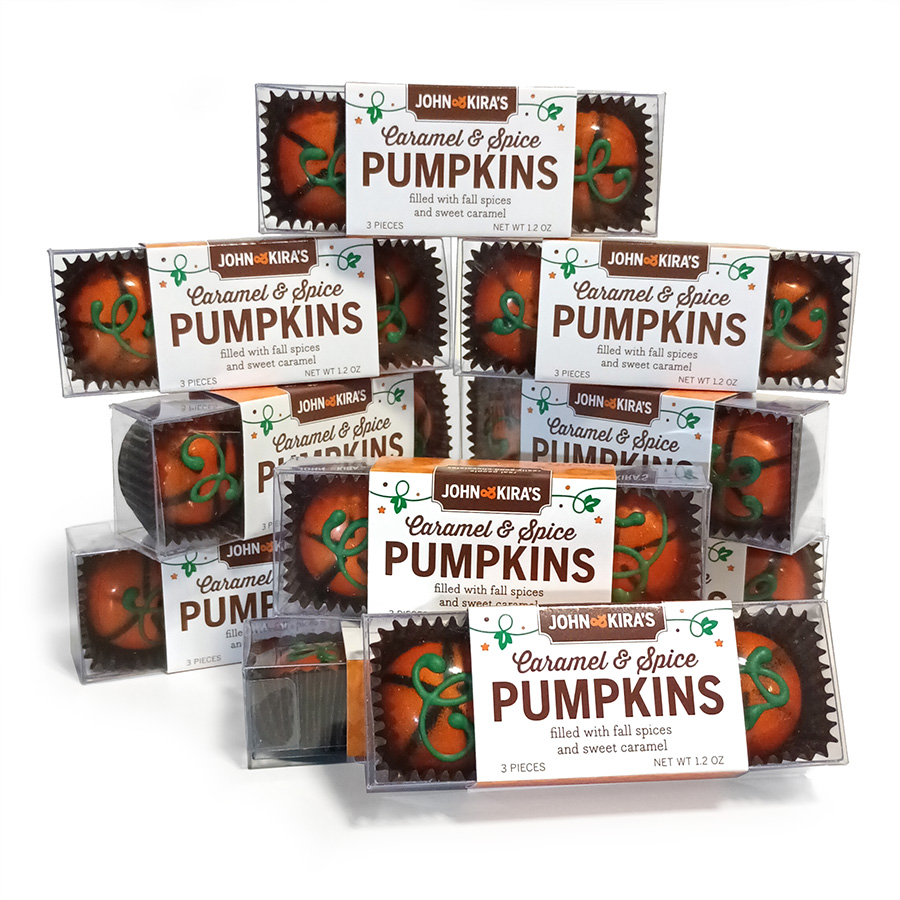 Dark chocolate, silky caramel, fall spices...all magically transformed into our enchanting Pumpkin Spice Caramels. Each 62% dark chocolate shell is meticulously painted by hand and finished with a hand-piped chocolate stem for added fall flourish. They'll be the highlight of any Halloween party or Thanksgiving dinner, or a great treat to celebrate the change of seasons.