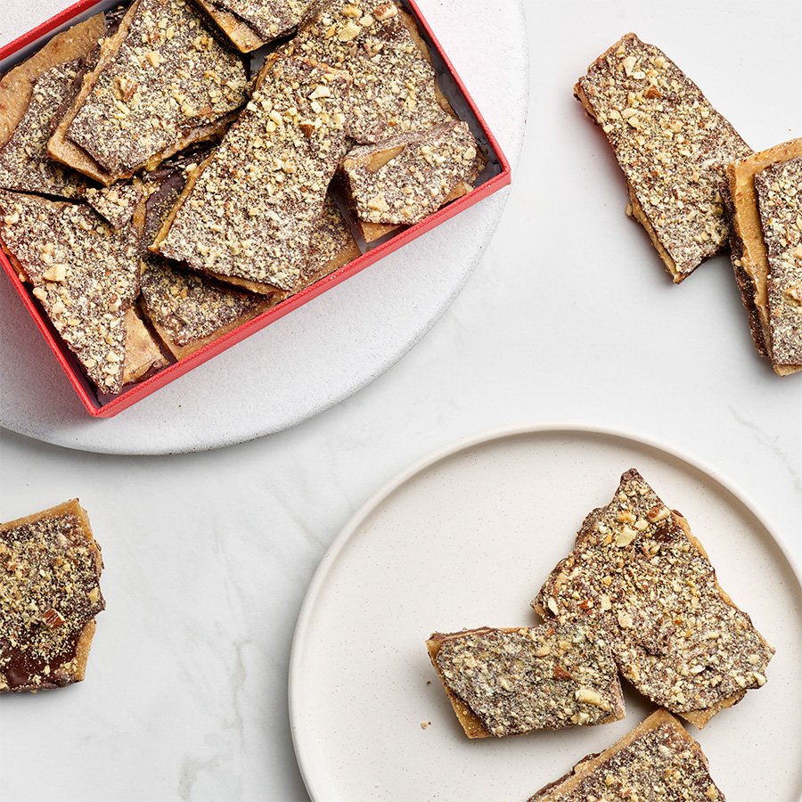 SHELF LIFE — Our toffee ships in a vacuum-sealed bag within the outer gift box. Unopened, it may be stored for up to 2 months at room temperature. For the best quality, toffee should be enjoyed within 5-7 days after opening.
