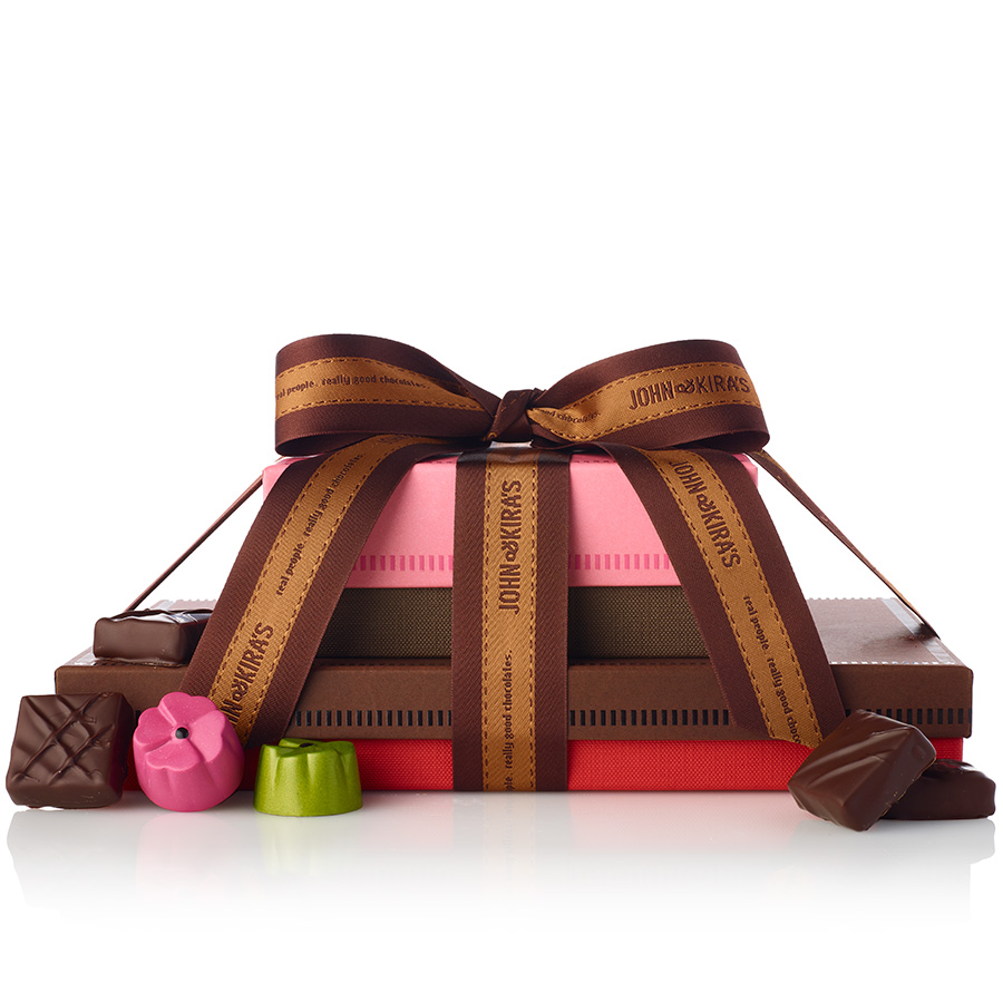 In this gift assortment, this new 9pc trio is featured atop our classic 28pc Every Flavor Collection, featuring 10 different flavors of various dark or milk chocolate ganache centers, each infused with either real herbs or fruit for remarkably fresh tasting, true to life flavor.